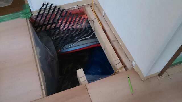 今日の工事は玄関からリビングに続く廊下や階段の下やトイレ部分の床下工事。