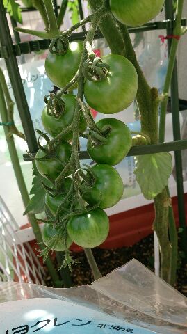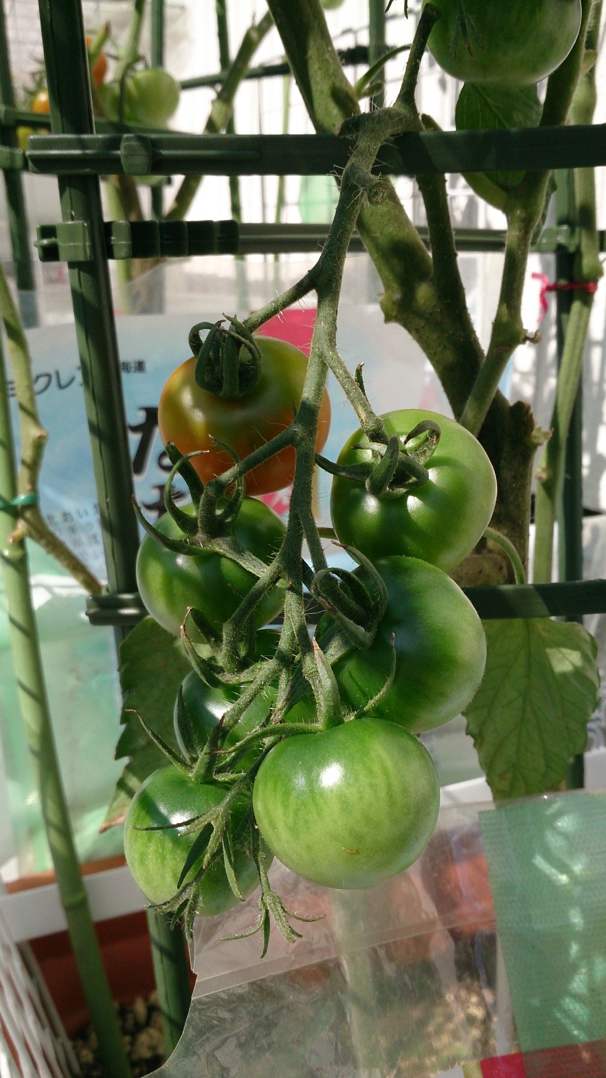 トマトはまだ青いですが、底の方が白くなってきたのでもうすぐ赤くなるそうです